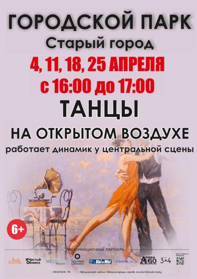 По субботам в апреле 2026 с 16:00 до 17:00 в Городском парке Обнинска будут проходить танцы на открытом воздухе, будет работать динамик у главной сцены парка.