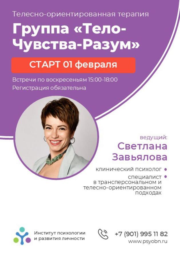 Подробнее о программе - https://telegra.ph/Gruppa-telesno-orientirovannoj-psihoterapii-TOP-04-16. Телесно-ориентированная психотерапия - это эффективный и бережный формат работы по изменению себя, по встраиванию нового поведения, новых реакций, установок, нового способа жить и взаимодействовать с близкими, родными, другими людьми.