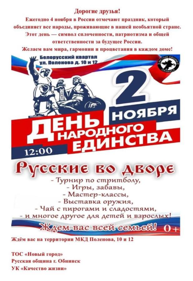 2 ноября в 12:00 в Белорусском квартале пройдёт уличный фестиваль «Русские во дворе», посвященный Дню народного единства.