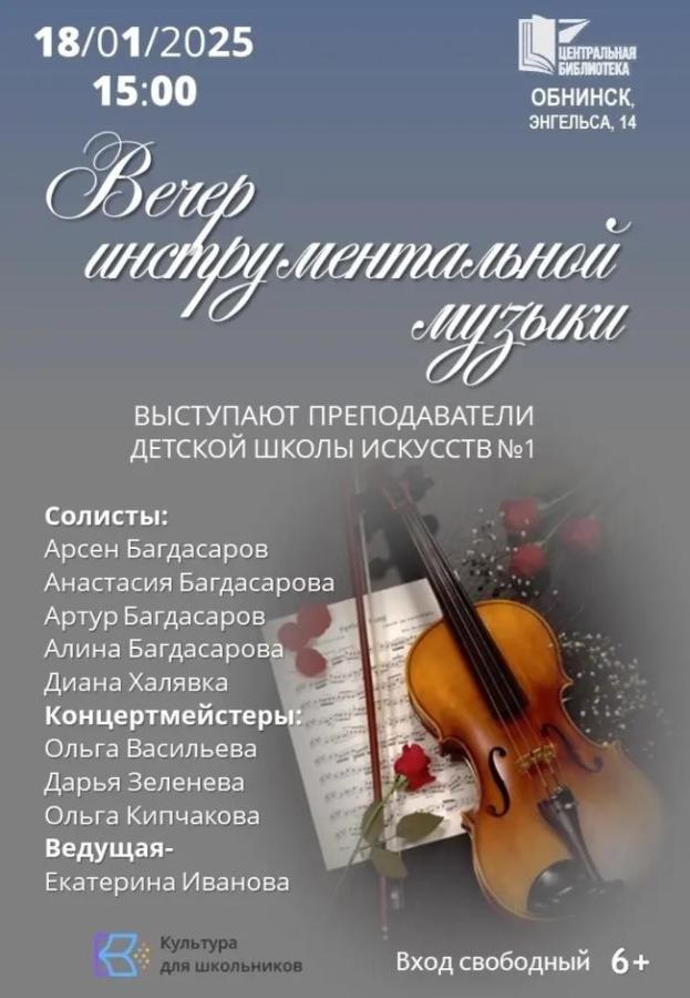 18 января 2026 в 15:00 в Центральной библиотеке в Обнинске состоится вечер инструментальной музыки. В программе концерта прозвучат камерные произведения различных эпох и стилей — от барокко до романтизма и танго нуэво.
