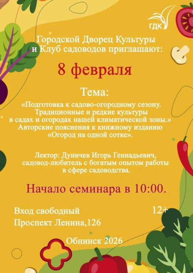 8 февраля 2026 в 10:00 в ГДк в Обнинске состоися встреча клуба садоводов на тему подготовки к садово-огородному сезону.