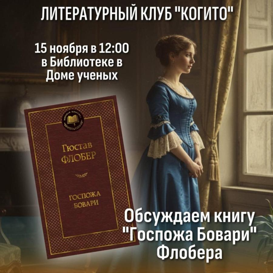 15 ноября 2025 в 12:00 в библиотеке № 7 в Доме учёных в Обнинске состоится встреча литературного клуба «Когито». Обсуждение «Госпожа Бовари» Флобера. Приходить можно, даже если вы не читали или не успели дочитать книгу.