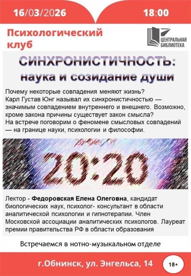 16 марта 2026 в 18:00 в Центральной библиотеке в Обнинске состоится встреча психологического клуба.