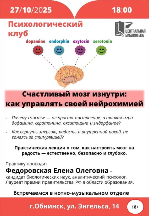 27 октября 2025 в 18:00 в Центральной библиотеке в Обнинске состоится встреча психологического клуба.