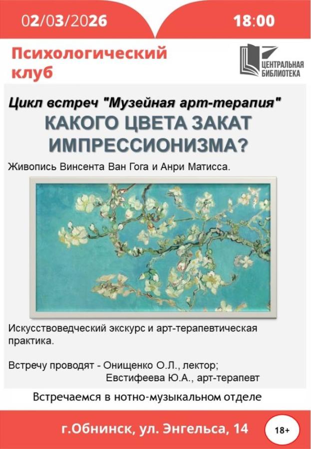 2 марта 2026 в 18:00 в Центральной библиотеке в Обнинске состоится встреча психологического клуба.