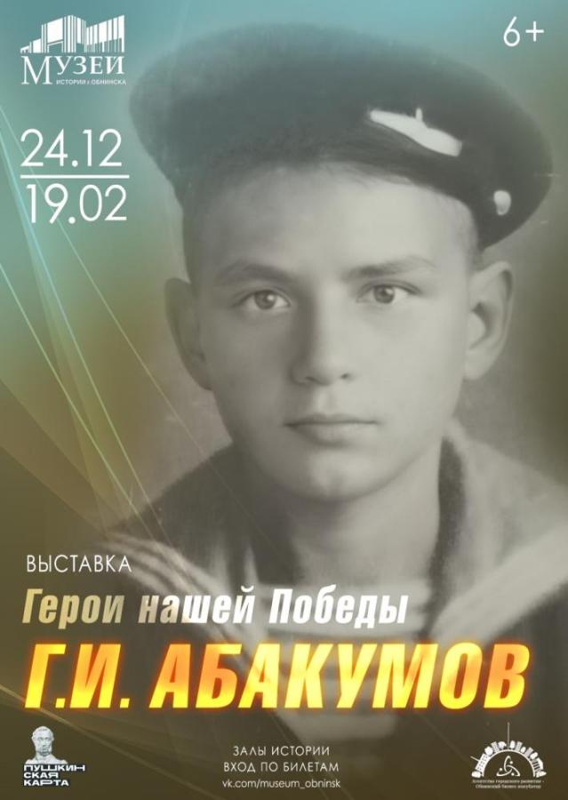 Выставка «Герои нашей Победы. Г.И. Абакумов» развёрнута в сменных витринах в разделе «События Великой Отечественной войны» и посвящена ветерану Великой Отечественной войны, ставшему в 13 лет юнгой Черноморского флота.