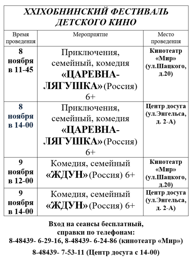 Кинотеатр «Мир» и Центр досуга в Обнинске приглашают на фестиваль детского кино 8 и 9 ноября 2025.
