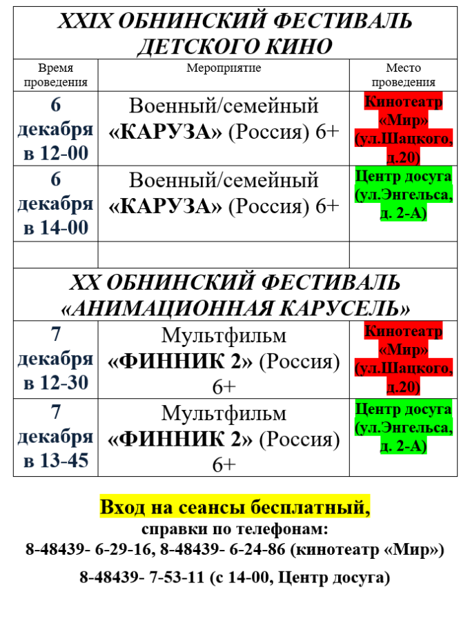 6 и 7 декабря 2025 в кинотеатре «Мир» и в Центре досуга пройдёт XXIX Обнинский фестиваль детского кино и XX Обнинский фестиваль «Анимационная карусель».