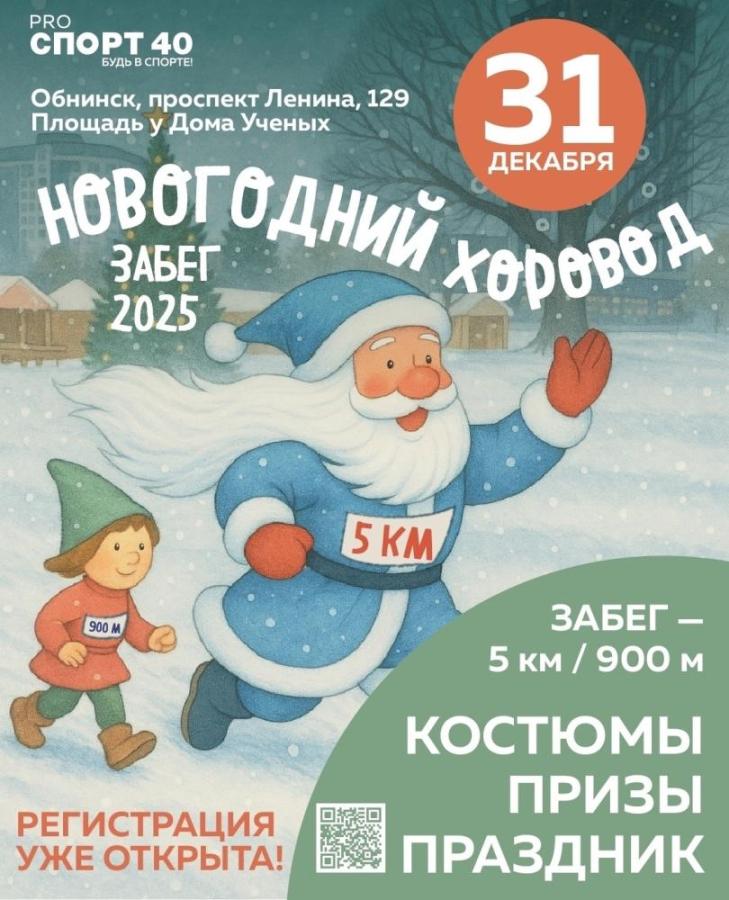 31 декабря 2025 в Обнинске на площади у дуба стартует забег «Новогодний хоровод». Регистрация участников «Новогоднего Хоровода» осуществляется на сайте проспорт40.рф. Предварительная заявка обязательна. Окончание регистрации: 30 декабря 2025 года (23.59) или по достижению лимита количества зарегистрированных участников. Справки не требуются.