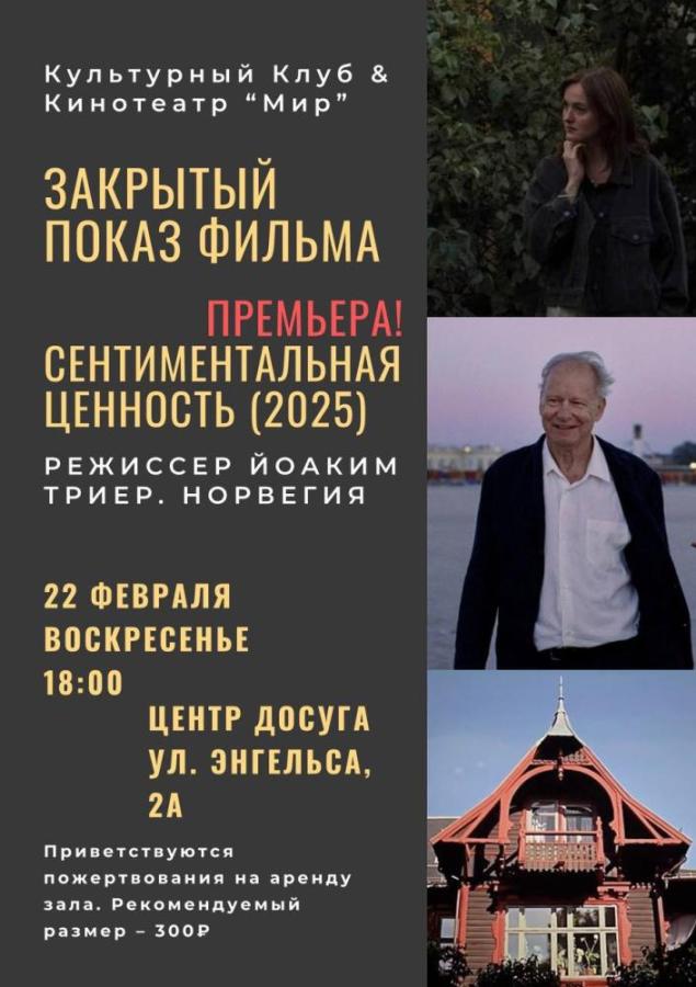 22 февраля 2026 в 18:00 в Центре досуга пройдёт закрытый показ фильм «Сентиментальная ценность» (2025) норвежского режиссера Йоакима Триера.