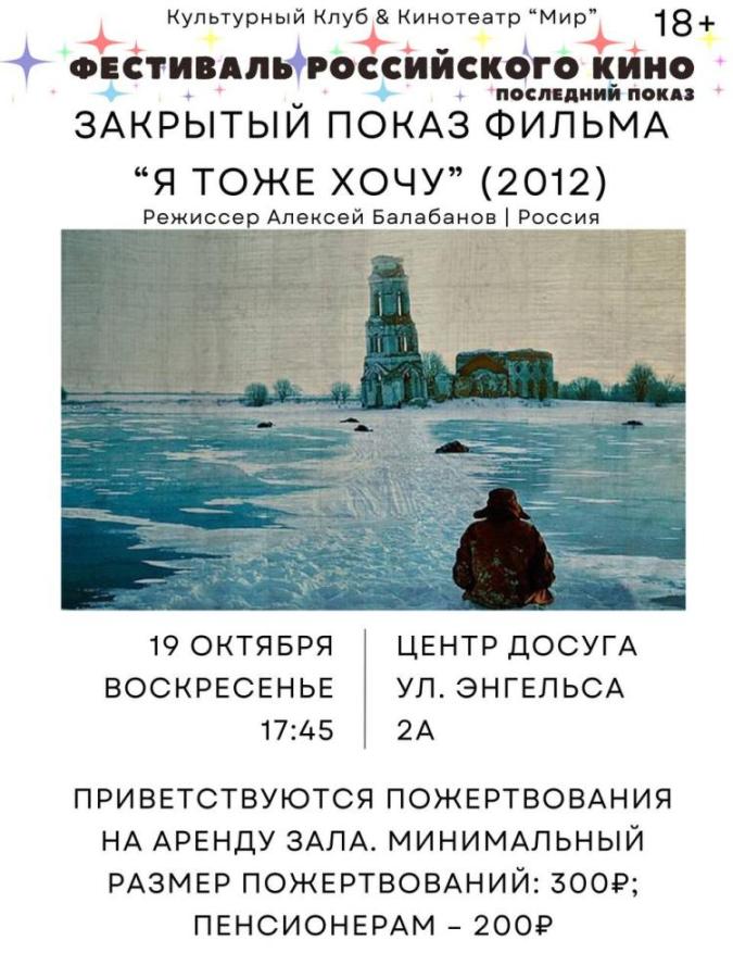 Фильм режиссера Андрея Балабанова. Продолжительность фильма: 1 ч. 29 м. Действие большинства фильмов Балабанова происходит в современной России. За свою творческую биографию ему удалось создать образ героя постсоветской эпохи с его легендами, желаниями и противоречивой судьбой. Фильмы режиссера навсегда зафиксировали образ давно ушедшего времени, войдя в число лучших российских кинокартин. Его фильмы обжигают и они непросты. Фильм «Я тоже хочу» отличается от всего, что сделал режиссер. Это прощание и завещание режиссера, — пронзительный и довольно личный и пророческий фильм о мистическом месте, где можно найти счастье.