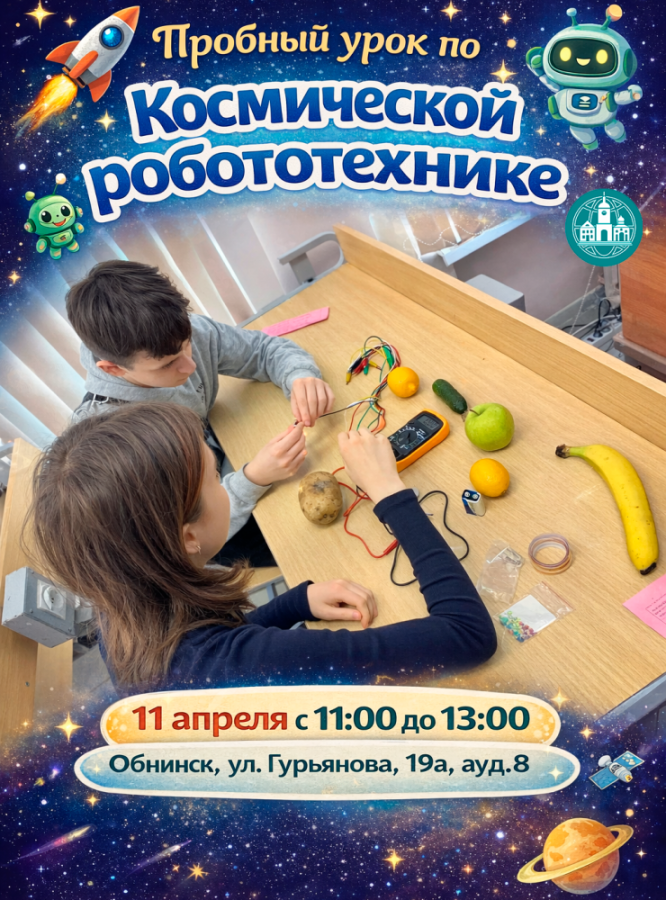 11 апреля 2026 с 11:00 до 13:00 в СГТИ (ауд. 8) в Обнинске пройдет пробное занятие по космической робототехнике для детей в возрасте 10–14 лет.